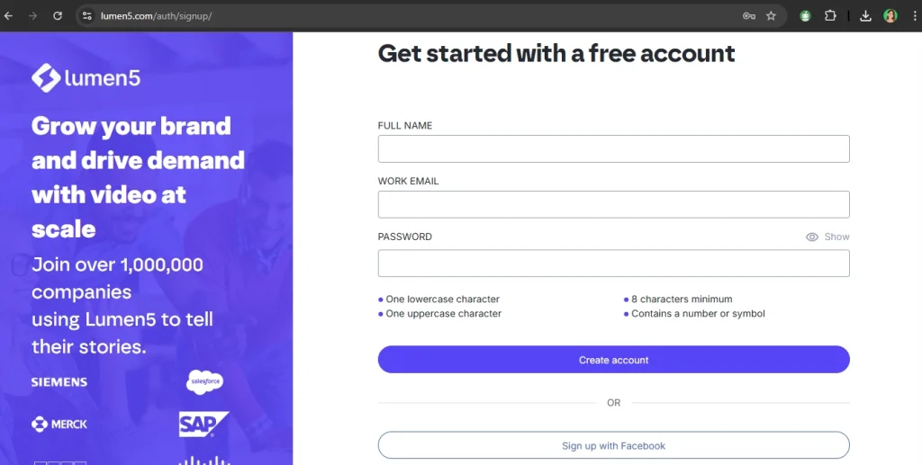 - Registro: Comienza creando una cuenta gratuita en Lumen5. La plataforma ofrece varias opciones, incluidas las gratuitas, para que puedas explorar todas sus funcionalidades.