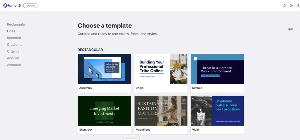 - Selección de plantilla: Lumen5 te permitirá elegir entre diferentes plantillas de video. Estas plantillas ya están optimizadas para diversos estilos de contenido, lo que te permite elegir la que mejor se ajuste a tu marca.