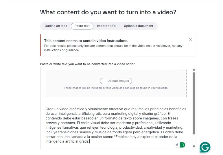 - Creación de proyecto: Una vez registrado, selecciona «Crear un nuevo proyecto» e ingresa el texto que deseas convertir en un video. Puedes usar artículos de blog, publicaciones o cualquier otro tipo de contenido escrito.