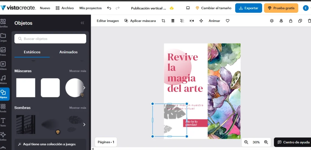 - Optimización con IA: VistaCreate sugiere combinaciones visuales armoniosas, automatiza animaciones y facilita la edición inteligente.