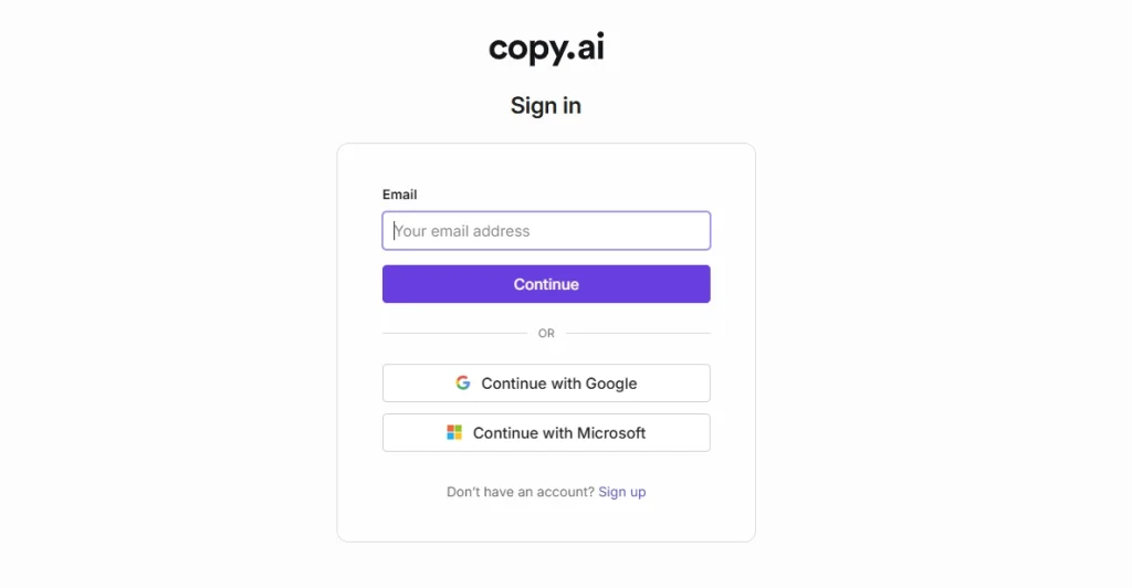 - Registro: Para empezar a usar Copy.ai, dirígete a su página web y regístrate utilizando tu correo electrónico. La plataforma ofrece una versión gratuita que puedes usar para probar todas sus funcionalidades.