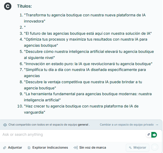 - Revisión y selección: Tras la generación de los textos, selecciona el que más te guste y haz los ajustes necesarios. La plataforma también te permitirá ver la eficacia de cada opción y cómo se adapta mejor a tu campaña.
